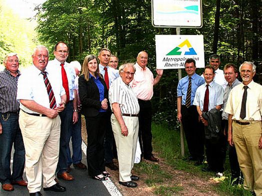 In Anwesenheit der Fraktionsvorsitzenden bzw. deren Stellvertreter im Verband Metropolregion Rhein-Neckar sowie zahlreicher weiterer Mitglieder der Verbandsversammlung wurde an der Baden-Württembergisch / Bayerischen Landesgrenze das erste Schild mit der Aufschrift "Metropolregion Rhein-Neckar" aufgestellt.